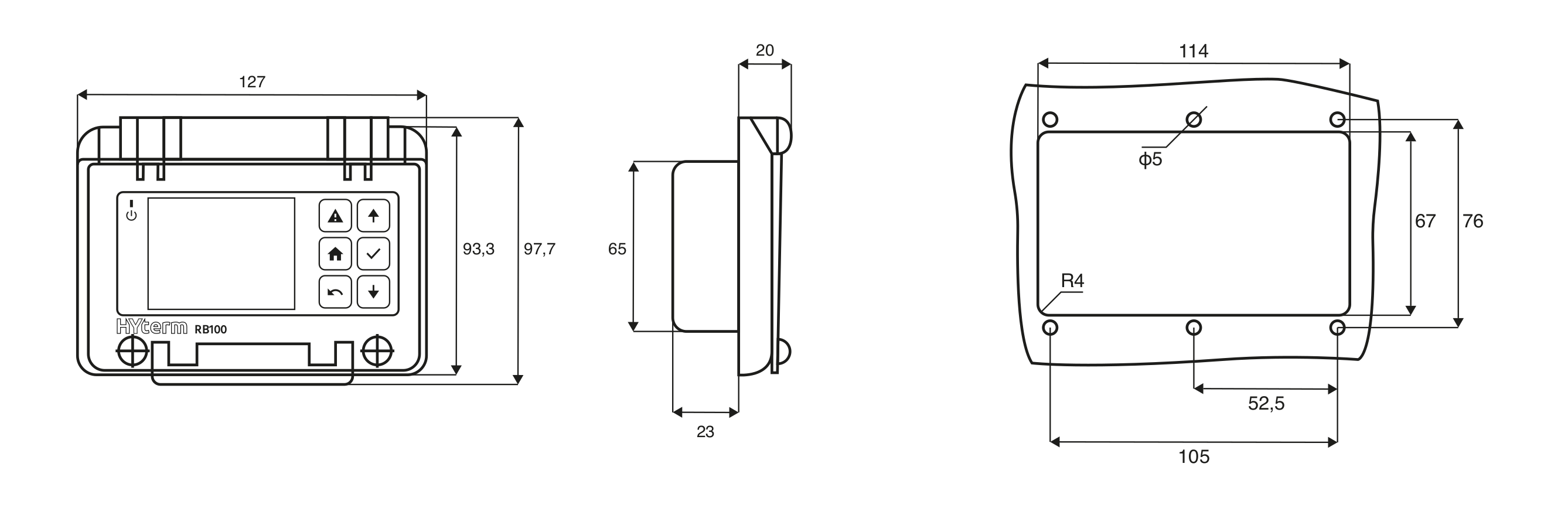 RB100 è un visualizzatore remoto per i controllori prodotti da Hyterm. E' equipaggiato con 6 tasti e un display TFT grafico con risoluzione 320x240 pixel, a colori e retroilluminato a LED.